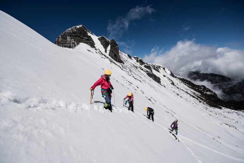 從圈谷底直上雪山,掛在陡峭雪坡上休息。
